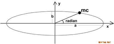a、b分别是椭圆在x、y坐标轴上的载距,代表椭圆的大小, radian不断递增即可实现mc坐标的变化,使mc在椭圆上的运动。椭圆的中心坐标为(0,0)。要平移椭圆,把mc的坐标加上中心坐标(cen_x,cen_y),具体表示方法: