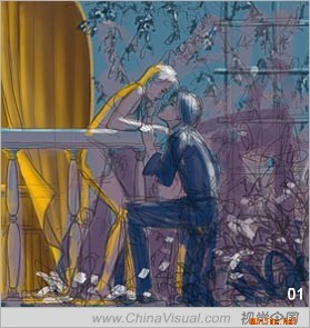 01 -在构思这幅画的时候,我知道我想要它唤起一种古典的浪漫主义情怀,同时又充满了现代主义气息,因此我让他爬上一个现代艺术装饰风格的建筑,并且让他们穿着当代时髦的衣服。尽管这幅作品的人物借鉴了沙士比亚的罗密欧与朱丽叶,但并不是他们。有许多人爬上阳台幽会过——沙翁不是第一个也不是最后一个想到它的人。是的,我知道克莱尔•丹妮丝和莱昂纳多•迪卡普里奥主演的那部电影,但是这幅画不是简单的将故事从荧屏上搬到了画板上。我用Painter 和Photoshop创作了它。