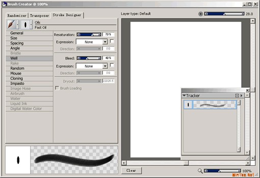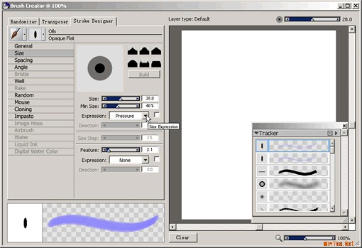 2.CTRL+B打开Brush Creator(笔刷设定器),painter 8之前的版本是CTRL+7打开Brush Controls(笔刷控制面板)。首先选择General(常规),在Opacity(不透明度)下面的Expression(表现形式)选择Pressure(压力)。这样修改后的变体可以根据运笔压力值的改变而改变笔刷的不透明度,鼠标和压感笔都有效。然后选择Size(尺寸),把Size(尺寸)改为28,Min Size(最小尺寸)改为40%,把Size Expression也改为Pressure(压力),这样绘制的笔触可以根据压力改变而改变大小。在Well(流出)选项中把Resaturation(不饱和度)改为70%,Bleed(渗透度)改为40%。painter 8的Brush Creator提供了笔刷试涂区,就是右边的框,Clear可以清除试涂区的笔触。