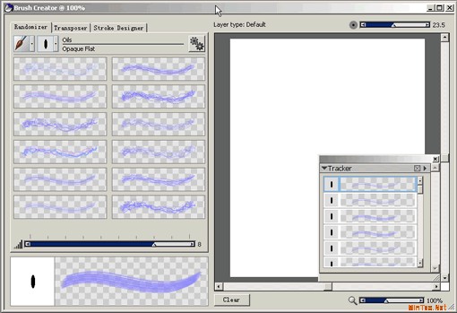4.Brush Creator(笔刷设定器)除了我们刚才定义笔刷用的Stroke Designer(笔触设计)以外还有两个选项栏。Randomizer(随机变化)这个选项可以选择随机变化的笔触,产生特殊的效果。下面的滑杆可以设定随机变化的强度。