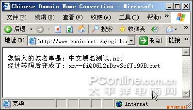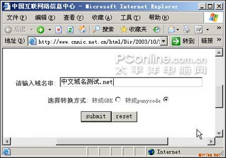 (2)使用CNNIC提供的中文域名在线转码程序。打开http://www.cnnic.net.cn/html/Dir/2003/10/29/1112.htm 后,输入要转换的中文域名,然后选择“转成punycode”,提交便可。