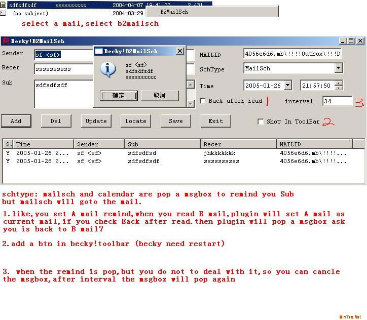 what''''s B2MailSch ------------- B2MailSch is a plugin for becky.it can remind you at the time that you set. B2MailSch is a free software, you can use wantonly and distribute, but must contain this text. If you are satisfied with my software and want to help me stay the best software , please donate as much as you can.Thanks!