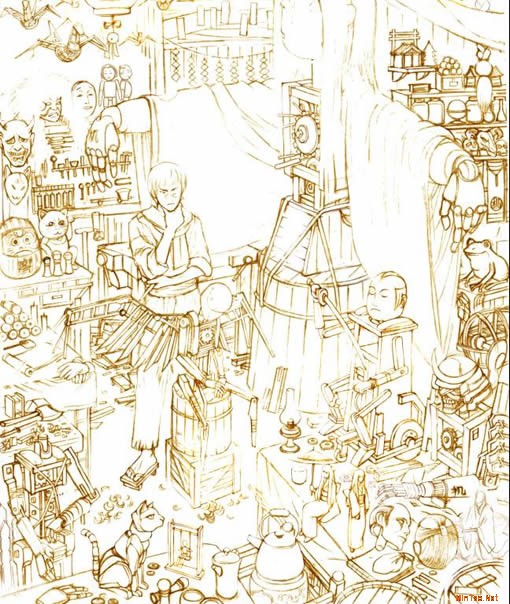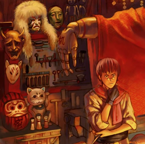 后来开始设想机物罗的工作环境,做为优秀人形师的工作间应该是堆满各种各样稀奇古怪好玩的东西,画出来一定很有意思。于是开始收集资料,日本的人偶,歌舞伎,和服等等姿料。首先说明在游戏中和游戏相关说明中都没机舞罗房子的介绍,现在要画这麽个场景细节要素全都需要自己去设想。所以图中除主体人物外其它部分都是原创的了。 之后画各种各样的构图。最后选定一张,完善成正稿,其间花了2-3天吧,因为所有细节全要刻画出来。机舞罗前面坐着的小人是自己后来加上去的。