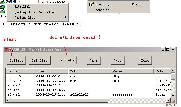 Using B2AFM_SF ------------- run b2.exe,choose a dir have some emails,click right mouse,choose "B2AFM_SF" menu. it will popup a dialog to collect the ath and del,save.