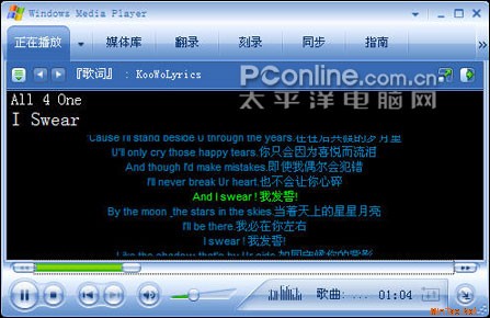 运行Windows Media Player,咋一看,似乎并没有什么不同,先别急,播放一个MP3文件,你便会在播放窗口中看到该歌曲所对应的歌词,随着歌曲的进度,歌词还会自动滚动,足以让你进行一次暴爽的KTV演唱。