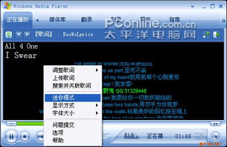 提示:右击播放窗口,然后选择“迷你模式”项,当最小化Windows Media Player时,便会出现精致的迷你播放窗口。