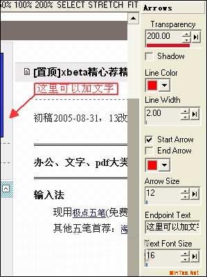 再为图片加一个箭头,点击( )按钮,同样,也出现了一个如此多功能的界面(图5):从上向下依次为透明度(可以直接输入、点按上下控件、弹出滑杆)、阴影、颜色、宽度、起止箭头、箭心颜色、箭头尺寸、尾注文字、尾注文字尺雨寸。