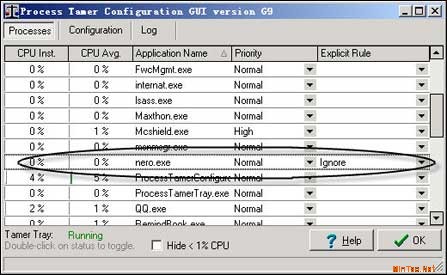 由于Process Tamer的自动调整机制可能造成一些问题,比如在CPU占用率高时自动降低正在进行记录操作的Nero进程优先级,有可能把盘刻“飞”,所以还需要手动更改一些设置。