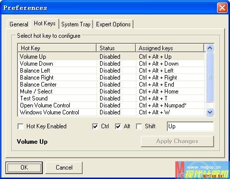接下来只要设置音量增加、减小、静音等设置选项即可。例如,设置音量增加选项“VolumeUp”项,再勾选“Hot Key Enabled”项,然后在右侧设置其快捷键,最后单击“Apply Changes”选项保存设置,按同样的方法将“Volume Down”(音量减小)、“Mute/Select”(静音)等一一设置好快捷键。这样设置后,就可以直接通过键盘上的相应快捷键来控制系统的音量大小了,简单的几步设置,一个普通键盘也成了多媒体键盘,不信你也试试吧。