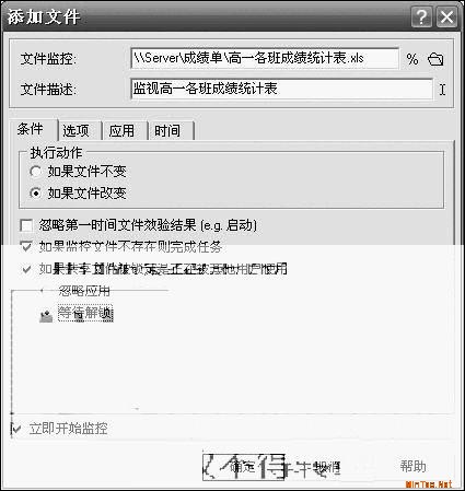 单击“选项”标签,进入设置监控时间间隔项,在“检查文件变动时间间隔”后的输入框中,可以直接输入秒数,也可以单击旁边的下拉列表按钮,从中选择时间间隔。这个可以根据自已的需要来设置,时间间隔设置的越小,监控就越及时,但占用的系统资源也越多。