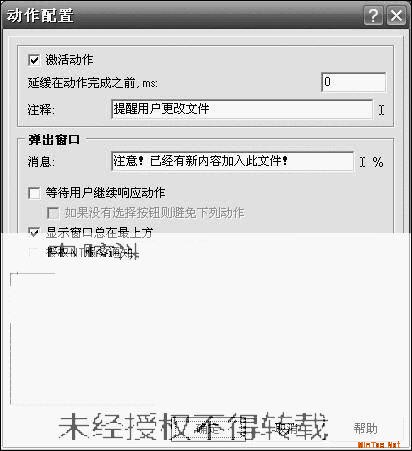 单击“应用”标签,进入通知动作设置,单击“新建”按钮,会出现一个动作下拉列表,其中有六种报警动作方式可供选择,如创建列表、执行程序、弹出窗口、播放音乐等,可根据需要选择一种或者多种报警方式,比如选择“弹出窗口”报警动作方式,此时会打开“动作配置”对话框。单击“注释”文本框,在后面输入“提醒用户更改文件”(此项仅用来说明本操作),再单击“消息”文本框,在后面输入“注意!已经有新内容加入此文件!”(如图3)。为了方便监控,我们可以利用“新建”按钮来创建一个声音报警动作方式。这样如果被监控文件有更改,软件就会弹出窗口并播放提示音(声音只支持WAV文件)。
