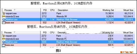 (如图2)可以看出,Empty.exe是释放处于后台的进程所占用内存空间,以此增加当前活动的进程可以使用的内存空间而达到优化性能的目的,类似于内存整理。但与某些内存整理工具相比,它是直接释放对应进程的内存。强于某些将数据直接转移至虚拟内存中而导致硬盘狂转的工具。
