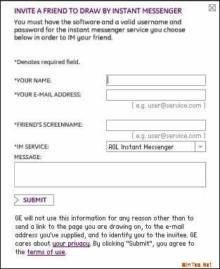 邀请涂鸦者将鼠标移动到右上角的“INVITE A FRIEND(邀请一个朋友)”图标上,在下拉菜单中选择“BY INSTANT MESSENGER(通过即时通讯工具)”或者“BY E-MAIL(通过电邮)”选项,就会弹出邀请界面,由于选择第一个选项只能通过“AOL Instant Messenger”软件发送即时消息给好友,没有该软件就只能通过第二选项进行邀请了。在邀请界面中输入你与好友的名称及邮箱(如图1),然后点击“SUBMIT(提交)”按钮,稍后会提示邀请信已发出,你的朋友也将收到该邮件,点击邮件中地址链接就可以加入到涂鸦页面了。同时,在涂鸦页面右上角及对应的画笔将显示参与者的名字,最多可以邀请两位朋友加入。
