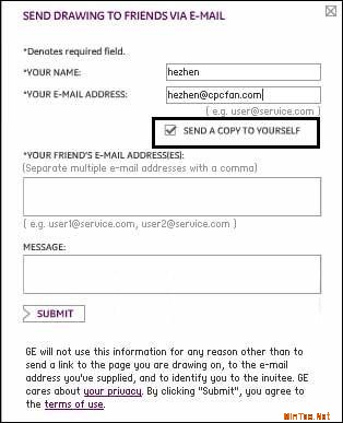SEND(发送):完成作品后,可以点击该按钮,在弹出对话框中输入发送对象的E-Mail及短信(如图4),再点击“SUBMIT(提交)”按钮,就可以让好友与自己分享作品了。勾选“SEND A COPY YOURSELF(给自己发个备份)”选项,将同时发送一份至自己的邮箱。
