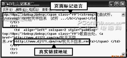 打开IE浏览器,点击“查看/源文件”选项,在打开的记事本中就可以看到网页的实际内容,它的内容中包含了在网页中要显示的图片、动画和音视频等文件的链接地址(以http://开头的文字),并用各式各样的标记语言对页面上的这些元素进行描述(例如字体、颜色、大小和位置)(如图1)。