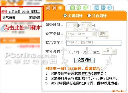 提示:使用265网页闹钟时,必须保持在线状态并且已连接到265主页。