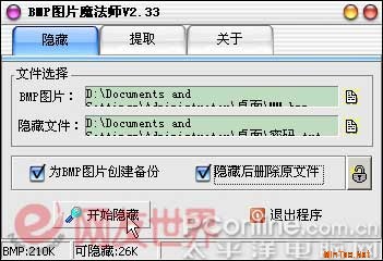 如果你想保留原来的BMP图片,可勾选“为BMP图片创建备份”选项;同时如果你想让这次隐藏行动更彻底,也可以勾选“隐藏后删除原文件”选项。最后为了将保密行动升级,还可以点击“锁头”图标,为文件提取时加入密码。全部工作完成后,只要点击“开始隐藏”按钮便大功告成了!