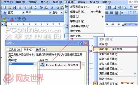 步骤1:以Word2003为例,运行Word后单击菜单栏的“工具→宏→录制新宏”命令,弹出录制宏窗口,按提示设置宏名称为“加密文档”,在“将宏指定到”选项下单击“工具栏”按钮(如图1)。在弹出的自定义窗口中,单击“命令“标签。在右侧窗格的“命令”下,使用鼠标将“Normal.newmacros.加密文档”拖拽到Word菜单栏的“工具”下放置。