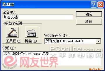 单击录制新宏窗口的“键盘”按钮,可设定运行宏的快捷键如Ctrl+Z,以后要加密文档只要按下快捷键即可。