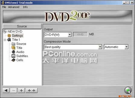 进入程序主界面后,点击第二项(部份光盘备份或合并),会弹出浏览文件夹的对话框,选择DVD光驱后点击“确定”按钮,进入细节设置窗口,点击左侧的“Settings”,然后在右则的“Output”的下拉列表中选择“DVD-R(W)”,MB字段则为4440不可改,当然也可以根据DVD刻录盘所能刻录的容量,选择“Custom”,然后在MB字段键入相应容量。在“Compression Mode”的下拉菜单中选择“Best quality”(图1)。