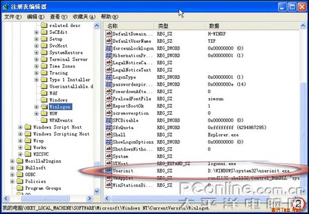 小提示:“userinit.exe”是Windows启动的一个关键程序,如图2所示,这是它在注册表中的自启动键值(HKEY_LOCAL_MACHINE\SOFTWARE\Microsoft\Windows NT\CurrentVersion\Winlogon),在该键值中,输入用逗号分隔的多个程序,“userinit.exe”能使它们在Windows启动时依次启动。