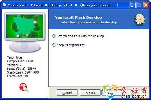 and fit in with the desktop”项(见图2),这样当Flash文件比桌面小时,系统会自动将其拉伸并铺盖整个桌面,单击“Next”后就可以设置相应的背景颜色或背景图片,单击“Apply”按钮就完成了,这时便会看到先前的Flash动画变成了桌面背景了。