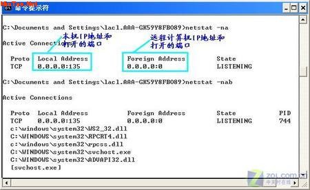 操作方法:单击“开始→程序→附件→命令提示符”,进入DOS窗口,输入命令 netstat -na 回车,于是就会显示本机连接情况及打开的端口,如图2。其中Local Address代表本机IP地址和打开的端口号(图中本机打开了135端口),Foreign Address是远程计算机IP地址和端口号,State表明当前TCP的连接状态,图中LISTENING是监听状态,表明本机正在打开135端口监听,等待远程电脑的连接。