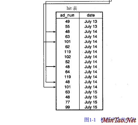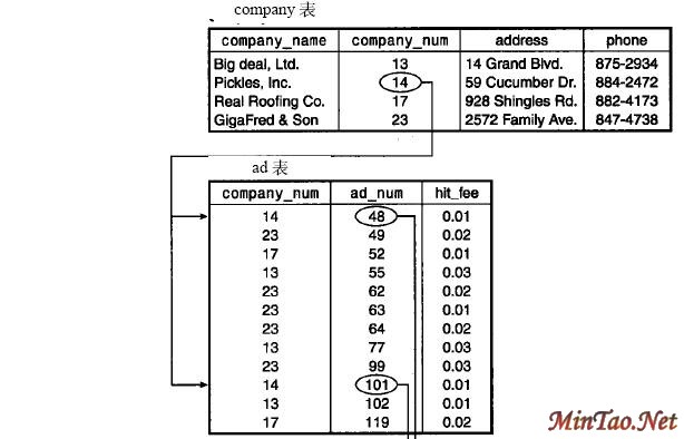 用。为了表示这些信息,要保存三个表(请参阅图1- 1)。一个是company 表,它含有公司名、编号、地址和电话号码等列。另一个是ad 表,它列出广告编号、拥有该广告的公司的编号以及每次点击时的计费数。第三个hit 表按广告编号记录广告点击次数以及广告提供服务的日期。