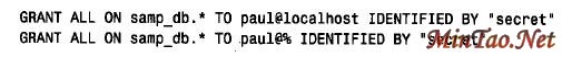 前一个命令在paul 从localhost(服务器运行在正运行的同一主机)连接时,允许它完全访问samp_db 数据库及它的所有表。它还给出了一个口令secret。第二个命令与第一个类似,但允许paul 从任何主机上连接(“%”为通配符)。也可以用特定的主机名取代“%”,使paul只能从该主机上进行连接。(如果您的服务器允许从localhost 匿名访问,由于服务器搜索授权表查找输入连接匹配的方式的原因,这样一个GRANT 语句可能是必须的。)关于GRANT语句以及设置MySQL用户账号的更详细信息,可在第11章“常规的MySQL管理”找到。