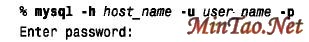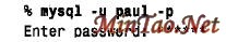 这个选项告诉mysql提示键入您的MySQL口令。注意:可用-pyour_password 的形式(可选择的形式: --password =your_password)在命令行上键入您的口令。但是,出于安全的考虑,最好不要这样做。选择-p 不跟口令告诉mysql在启动时提示您键入口令。例如: