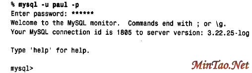在看到Enter password: 时,键入口令即可。(口令不会显到屏幕,以免给别人看到。)请注意,MySQL口令不一定必须与UNIX 或Windows 口令相同。如果完全省略了-p 选项,mysql就认为您不需要口令,不作提示。请注意: -h 和-u选项与跟在它们后面的词有关,无论选项和后跟的词之间是否有空格。而-p 却不是这样,如果在命令行上给出口令, -p 和口令之间一定不加空格。例如,假定我的MySQL用户名和口令分别为paul 和secret,希望连接到在我注册的同一机器上运行的服务器上。下面的mysql命令能完成这项工作: