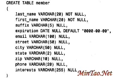 从列的类型来看,member 表并不很有趣:所有列中,除了一列之外,其他列都是可变长字符串。这个例外的列就是e x p i r a t i o n,为DATE 型。终止日期值有一个缺省值为“0 0 0 0 - 0 0 -0 0”,这是一个非NULL 的值,它表示未输入合法的日期值。这样做的原因是expiration 可以是NULL,它表示一个会员是终身会员。但是,因为此列可以为NULL,除非另外指定一个不同的值,否则它将取缺省值“ 0 0 0 0 - 0 0 - 0 0”。如果创建了一个新会员记录,但忘了指定终止日期,该会员将成为一个终身会员!通过采用缺省值“ 0 0 0 0 - 0 0 - 0 0”的方法,避免了这个问题。它还向我们提供了一种手段,即可以定期地搜索这个值,以找出过去未正确输入终止日期的记录。