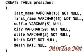 不管用哪种方法调用mysql,都应该在命令行中数据库名的前面指定连接参数(主机名、用户名或口令)。CREATE TABLE 语句中每个列的说明由列名、类型(该列将存储的值的种类)以及一些可能的列属性组成。president 表中所用的两种列类型为VARCHAR 和DATE。VARCHAR(n)代表该列包含可变长度的字符(串)值,其最大长度为n 个字符。可根据期望字符串能有多长来选择n 值。