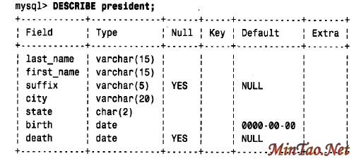 如果发布一个DESCRIBE member 查询,mysql也会显示member 表的类似信息。DESCRIBE 在您忘了表中的列名、需要知道列的类型、了解列有多宽等的时候很有用。它对于了解MySQL存储表行中列的次序也很有用。列的这个存储次序在使用INSERT 或LOAD DATA 语句时非常重要,因为这些语句期望列值以缺省列的次序列出。DESCRIBE 可以省写为DESC,或者,如果您喜欢键入较多字符,则DESCRIB Etbl_name 另一个等同的语句为SHOW COLUMNS FROM tbl_name。