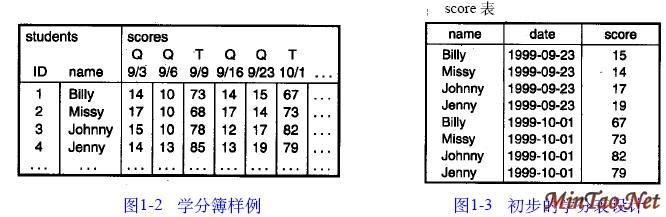 为了知道学分保存方案需要什么表,我们来看看在原来学分簿上是怎样记学分的。图1- 2示出学分簿的一页。该页的主体是一个记录学分矩阵。还有一些对学分有意义的必要信息。学生名和ID 号列在矩阵的一端。(为了简单好看,只列出了四个学生。)在矩阵顶端,记录了进行测验和测试的日期。图中示出9月3号、6号、16号和2 3号进行测验, 9月9号和10月1号进