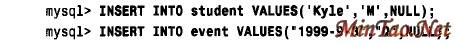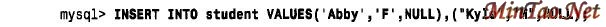 “I N TO”一词自MySQL3.22.5 以来是可选的。(这一点对其他形式的INSERT 语句也成立。)VALUES 表必须包含表中每列的值,并且按表中列的存放次序给出。(一般,这就是创建表时列的定义次序。如果不能肯定的话,可使用DESCRIBE tbl_name 来查看这个次序。)在MySQL中,可用单引号或双引号将串和日期值括起来。上面例子中的NULL值是用于student 和event 表中的AUTO_INCREMENT 列的。(插入“错误”的值将导致下一个student_id 或event_id 号的自动生成。)自3.22.5 以来的MySQL版本允许通过指定多个值的列表,利用单个的INSERT语句将几行插入一个表中,如下所示: