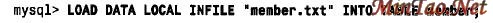 该语句读取位于客户机上当前目录中数据文件member.txt 的内容,并将其发送到服务器装入member 表。如果您的MySQL版本低于3 . 2 2 . 15,则LOAD DATA LOCAL 不起作用,因为那时从客户机读取数据的能力是在LOAD DATA 上的。(没有LOCAL 关键字,被读取的文件必须位于服务器主机上,并且需要大多数MySQL用户都不具备的服务器访问权限。)缺省时,LOAD DATA 语句假定列值由tab 键分隔,而行则以换行符结束。还假定各个值是按列在表中的存放次序给出的。也有可能需要读取其他格式的文件,或者指定不同的列次