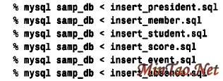 每个文件都含有一个删除可能曾经插入到表中的记录的DELETE 语句,后跟一组INSERT 语句以初始化表的内容。如果不希望分别键入这些命令,可试一下下列语句: