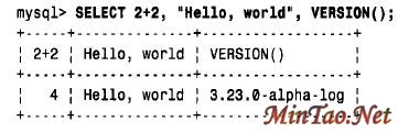 为了编写SELECT 语句,只需指定需要检索什么,然后再选择某些子句即可。刚才给出的子句“ FROM”、“WHERE”是最常用的,还有一些其他的子句,如GROUP BY、ORDER BY和LIMIT 等。FROM 子句一般都要给出,但是如果不从表中选择数据,也可不给出。例如,下列查询只显示某些可以直接计算而不必引用任何表的表达式的值,因此不需要用FROM 子句: