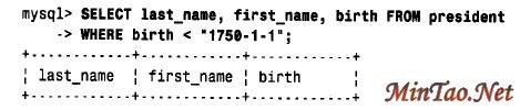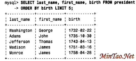 4. 限制查询结果如果一个查询返回许多行,但您只想看其中的几行,则可以利用LIMIT 子句,特别是与ORDER BY 子句结合时更是如此。MySQL允许限制一个查询的输出为前n 行。下面的查询选择了5 位出生日期最早的总统: