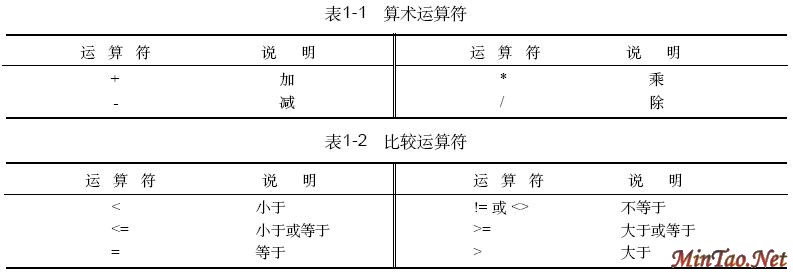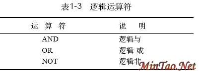 WHERE 子句中的表达式可使用表1-1中的算术运算符、表1-2 的比较运算符和表1-3 的逻辑运算符。还可以使用圆括号将一个表达式分成几个部分。可使用常量、表列和函数来完成运算。在本教程的查询中,我们有时使用几个MySQL函数,但是MySQL的函数远不止这里