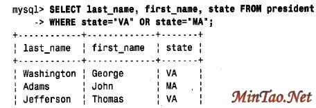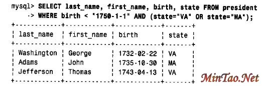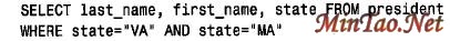 错了,因为这个查询的意思是“选择既出生在Vi rginia 又出生在M a r y l a n d的总统”,不可能有同时出生在两个地点的总统,因此这个查询无意义。在英语中,可以用“a n d”表示这种选择,但在SQL 中,应该用OR 来连接两个条件,如下所示: