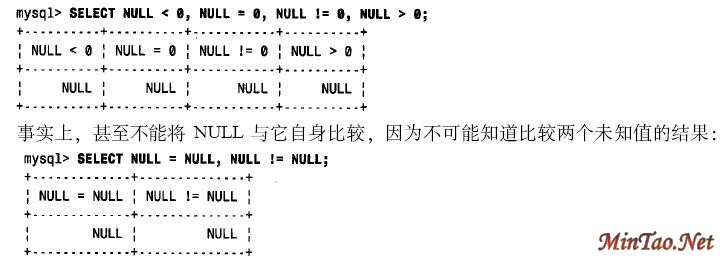 NULL 值是特殊的;因为它代表“无值”。不可能以评估两个已知值的相同方式来将它与已知值进行评估。如果试图与通常的算术比较运算符一道使用NULL,其结果是未定义的: