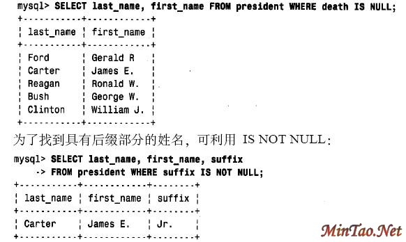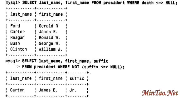 为了进行NULL 值的搜索,必须采用特殊的语法。不能用= 或!= 来测试等于NULL 或不等于NULL,取而代之的是使用IS NULL 或IS NOT NULL 来测试。例如,因为我们将健在总统的死亡日期表示为NULL,那么可按如下语句查找健在的总统: