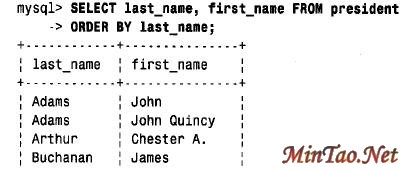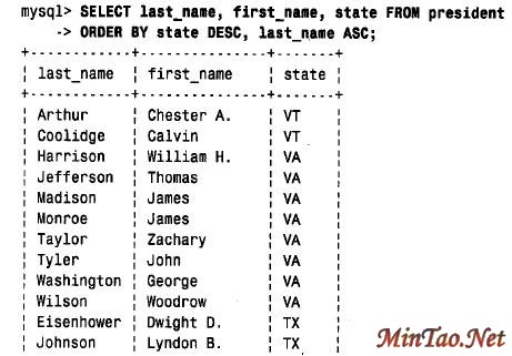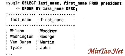 在ORDER BY 子句中,可在列名之后利用ASC 或DESC 关键字指定排序是按该列值的升序或降序进行的。例如,为了按倒序(降序)名排列总统名,可如下使用DESC: