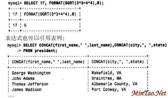 前面的多数查询通过从表中检索值已经产生了输出结果。MySQL还允许作为一个公式的结果来计算输出列的值。表达式可以简单也可以复杂。下面的查询求一个简单表达式的值(常量)以及一个涉及几个算术运算符和两个函数调用的较复杂的表达式的值: