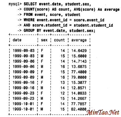 可利用诸如COUNT( ) 和AVG( ) 这样的函数生成多个列上的汇总,即使这些列来自不同的表也是如此。下面的查询确定学分数,以及事件日期与学生性别的每种组合的平均学分。