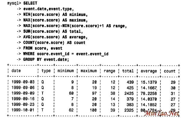 前面,在“生成汇总”一节中,我们执行了一个查询,它生成score 表中数据的数值特征。该查询的输出列出了事件ID,但不包括学分日期或类型,因为我们不知道怎样将score 表连接到event 表以得到学分的日期和类型。现在可以做到了。下面的查询类似于早先的那个,但是它给出了学分的日期和类型而不只是简单的数字事件ID: