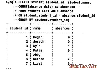 LEFT JOIN 而不涉及WHERE 子句中的学生ID。LEFT JOIN要求MySQL对从连接首先给出的表中选择每行生成一个输出行(即LEFT JOIN 关键字左边给出的表)。由于首先给出student 表,我们得到了每个学生的输出结果,即使是那些在absence 表中未给出的学生也都包括在输出中。此查询如下:
