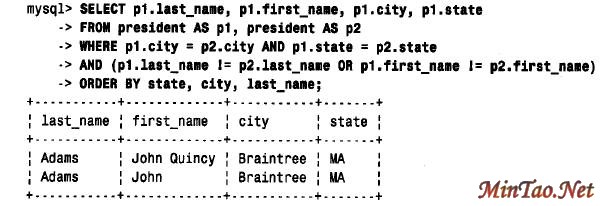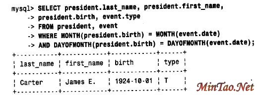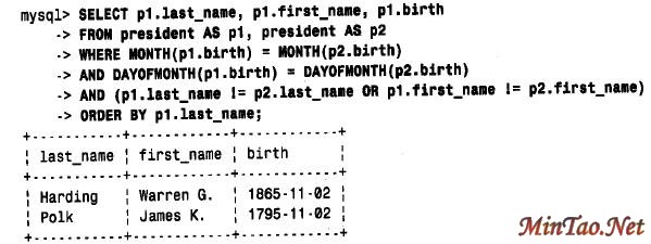 ■ 每个总统的记录与自身相匹配,但是我们不希望在输出中看到同一总统出再现两次。WHERE 子句的第二行保证比较的记录为不同总统的记录,使记录不与自身匹配。可以编写一个查找出生在同一天的总统的类似查询。出生日期不能直接比较,因为那样会错过出生在不同年份的总统。我们用MONTH( ) 和DAYOFMONTH( ) 来比较出生日期的月和日,相应的查询如下: